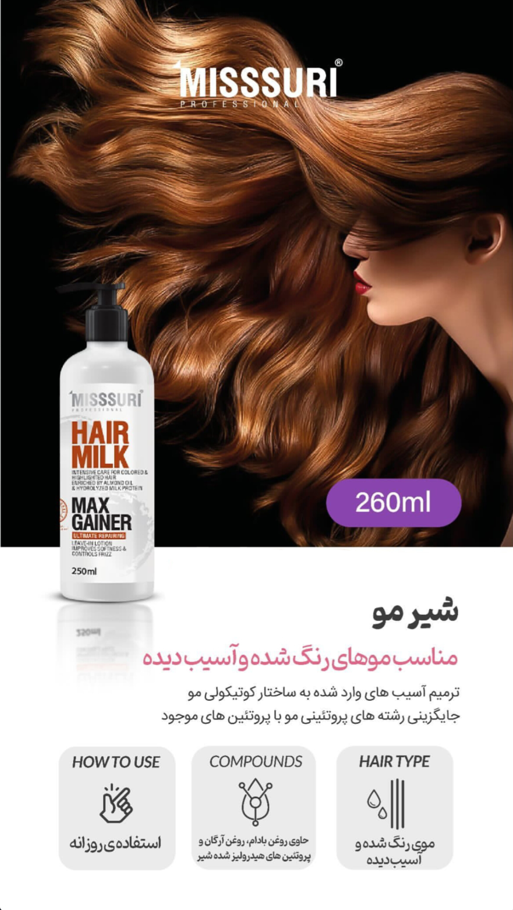 لوسیون مو بدون آبکشی میسوری MAX GAINER، حاوی پروتئین شیر و روغن بادام