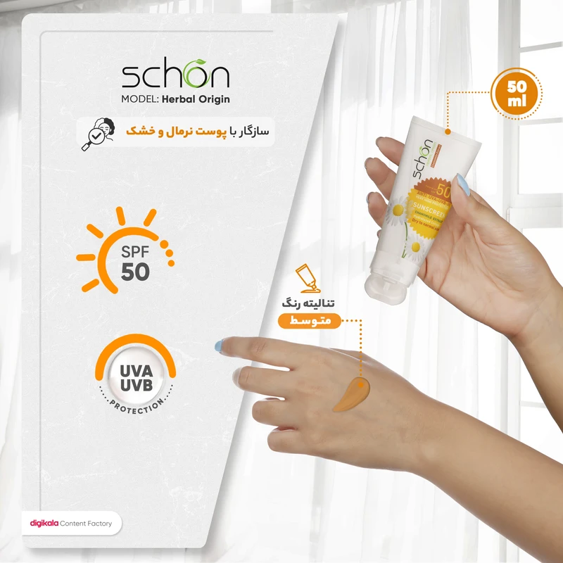 ضدآفتاب شون با SPF50 _ رنگی طبیعی | مناسب پوست ترمال تا خشک _ با عصاره بابونه