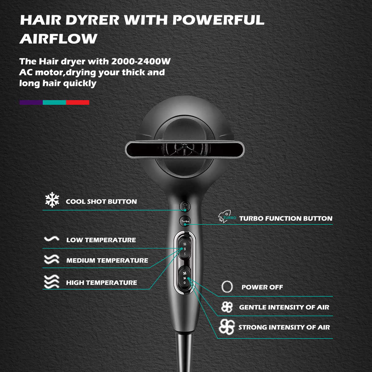 تنظیم حرارت و سرعت: چند حالت قابل تنظیم متناسب با نوع مو(نازک، معمولی یا ضخیم)
